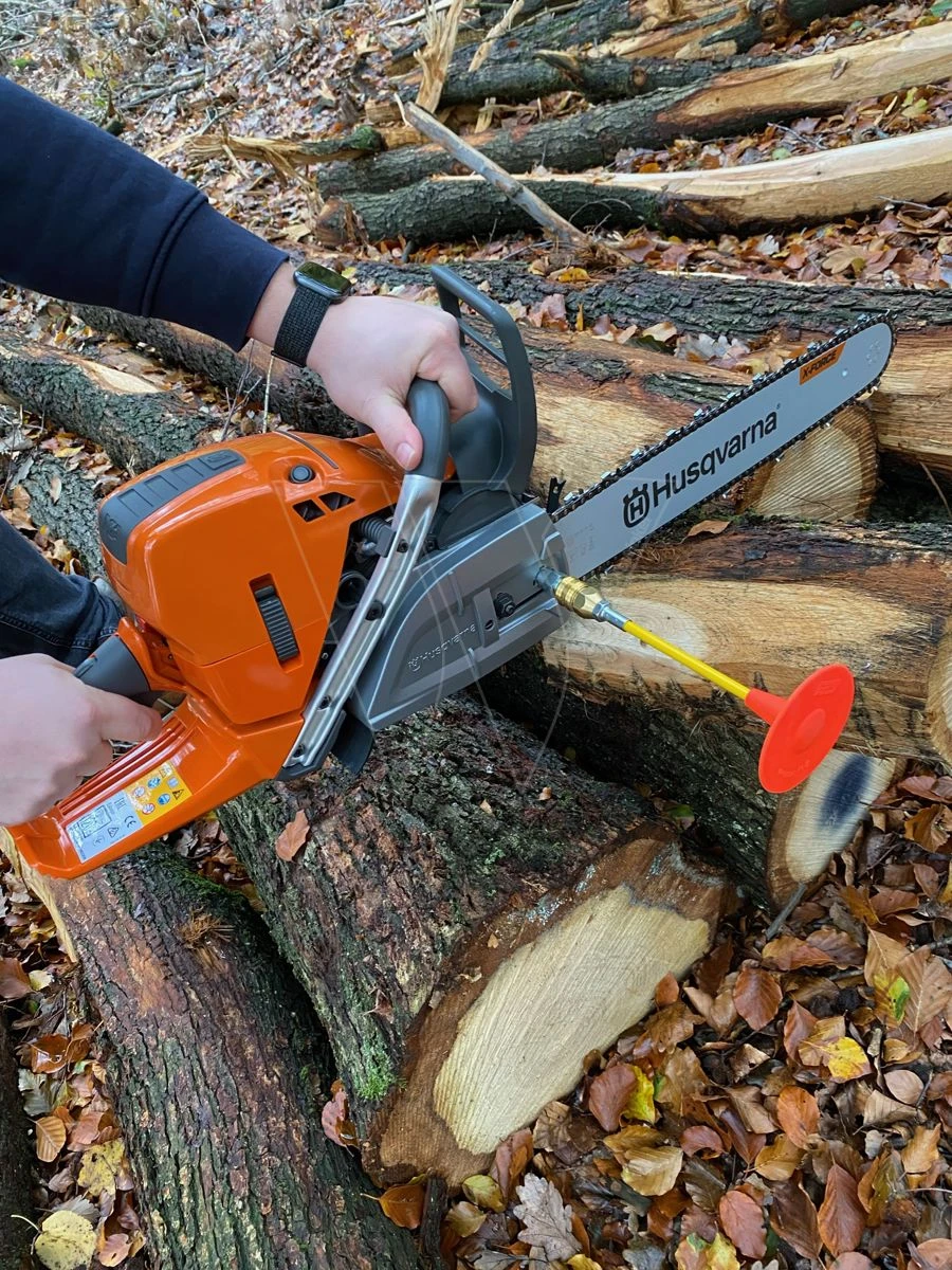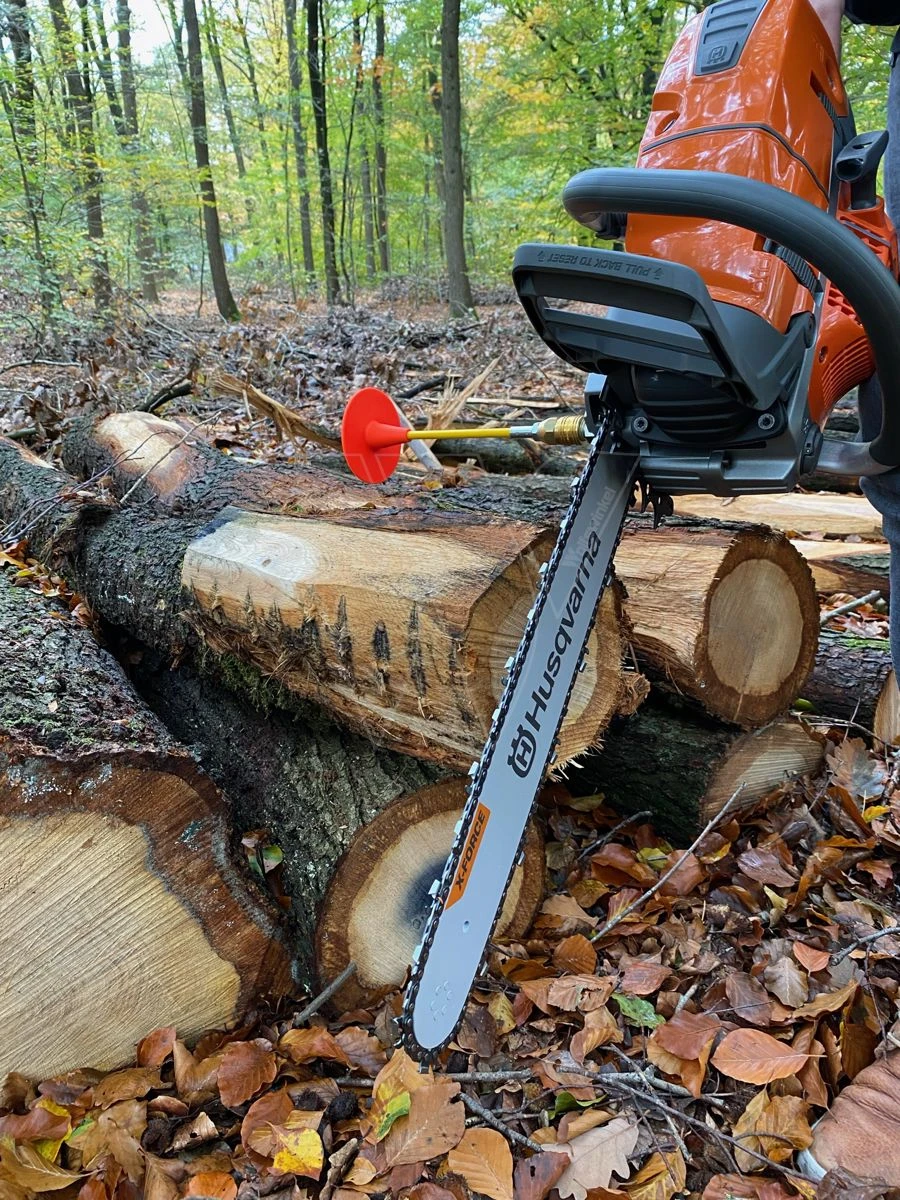 Daarom is deze afkort hulp van Cut-Control ontwikkeld! Hij past makkelijk op de zaag door middel van een adapter die standaard is mee geleverd. Deze adapter heeft een schroefdraad van M8, en vervangt de dekmoer die de kettingkap op de kettingzaag tegenhoudt. De adapter werkt als een koppeling van de compressorslang en is dus zeer gemakkelijk aan te sluiten maar er ook weer af te halen als u niet met de afkorthulp wilt werken!