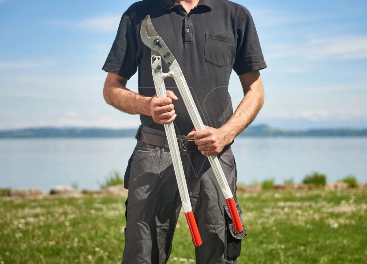 Grote tweehandige takkenschaarschaar, ideaal voor het snoeien van bomen en struiken, voor wijngaarden en boomkwekerijen. Tweehandige snoeischaren zijn het ideale gereedschap voor het knippen van moeilijk bereikbare takken. Er kan gemakkelijker mee worden geknipt.
