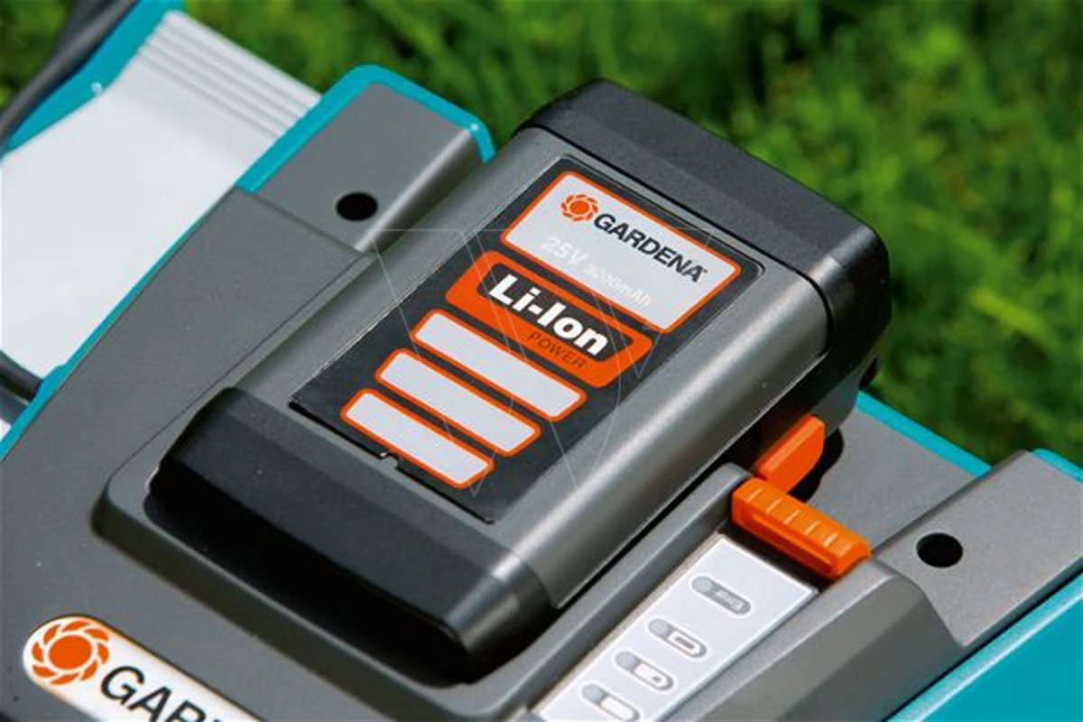 De grasmaaier wordt door een onderhoudsarme oplaadbare lithium-ionaccu van 25 V/3,2 Ah gevoed. Deze accu kan op elk moment worden opgeladen, zonder gevolgen voor de geheugenfunctie. Zonder accu kan de accukooimesmaaier als handmaaier worden gebruikt. De GARDENA Accukooimesmaaier is voorzien van vele comfortelementen waarmee het werk gemakkelijker en aangenamer wordt. Het apparaat heeft bijvoorbeeld extra grote wielen met speciaal profiel, onderdelen van zachte kunststof, een ergonomisch gevormde beugel, die inklapbaar is om ruimte te besparen bij het opbergen. Door een handige regelaar kan de gewenste maaihoogte gemakkelijk worden ingesteld.