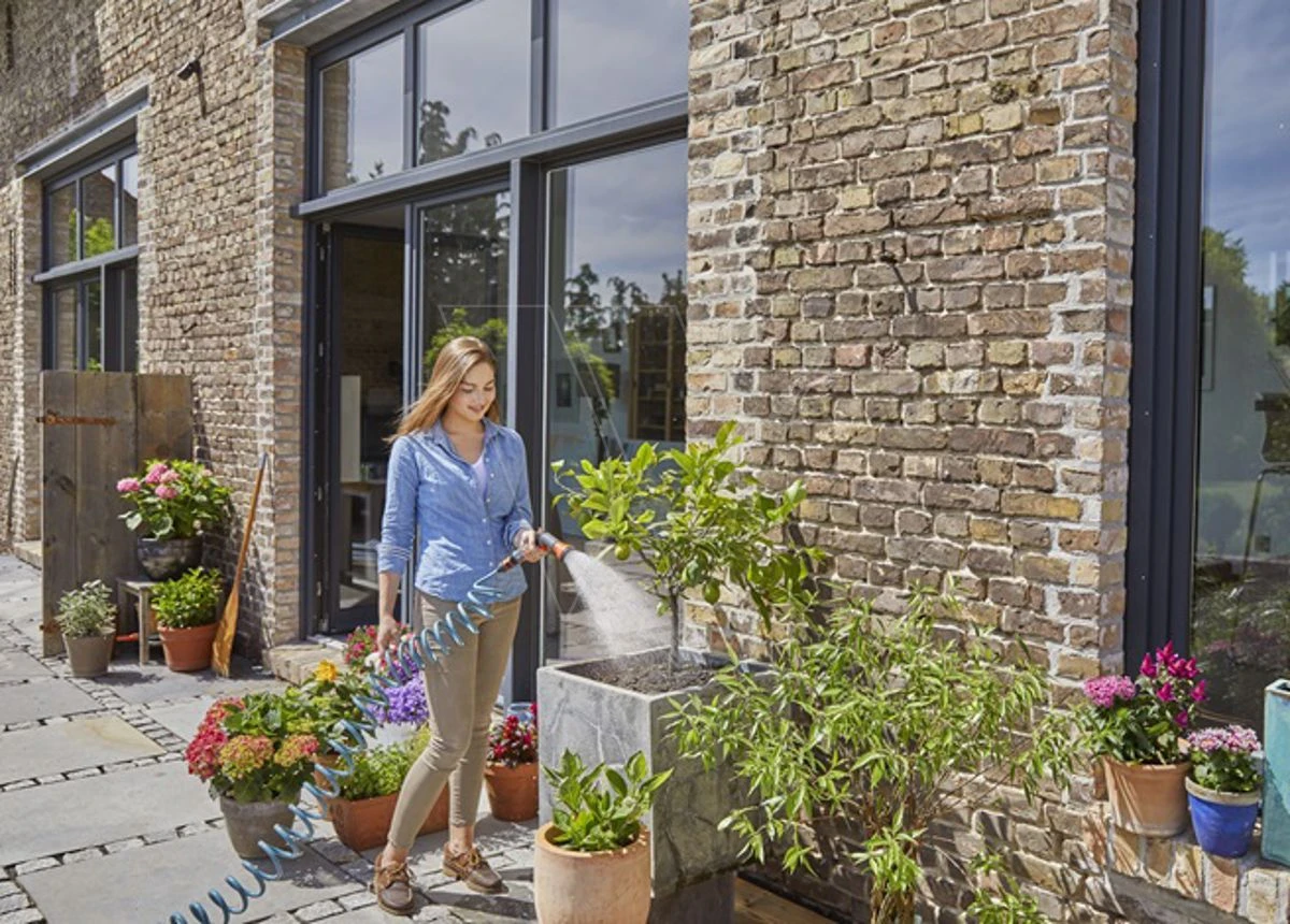 De meegeleverde pistoolbroes ligt goed in de hand, de waterhoeveelheid kan traploos worden geregeld en de impulsgreep kan desgewenst worden ingesteld. De GARDENA spiraalslang-set is het praktische en complete systeem voor het sproeien van kleine tuinparadijsjes. Met pistoolbroes (art.nr. 8120) en kraanstukken (art. nr. 900, 901 en 902).