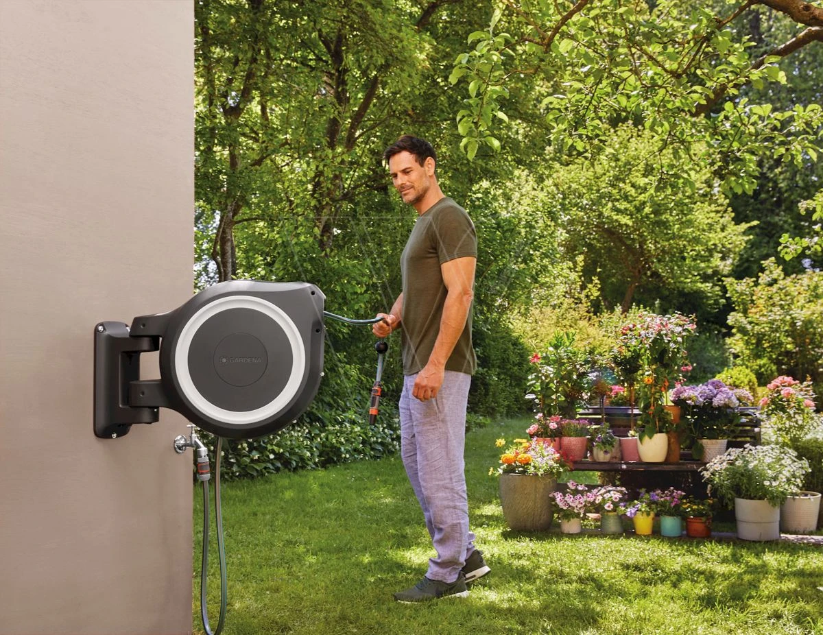 Dankzij de handige muurbeugel kan de slangenhouder 180 graden worden gedraaid en uw bewegingen in de tuin ongemerkt volgen. Hierdoor kunt u uw bewateringswerkzaamheden eenvoudig uitvoeren, hebt u maximale bewegingsvrijheid en knikt de slang niet. De slang hoeft niet te worden gebogen of gedraaid als u hem wilt oprollen: lichtjes trekken aan het uiteinde van de slang is voldoende om de vergrendeling los te maken.