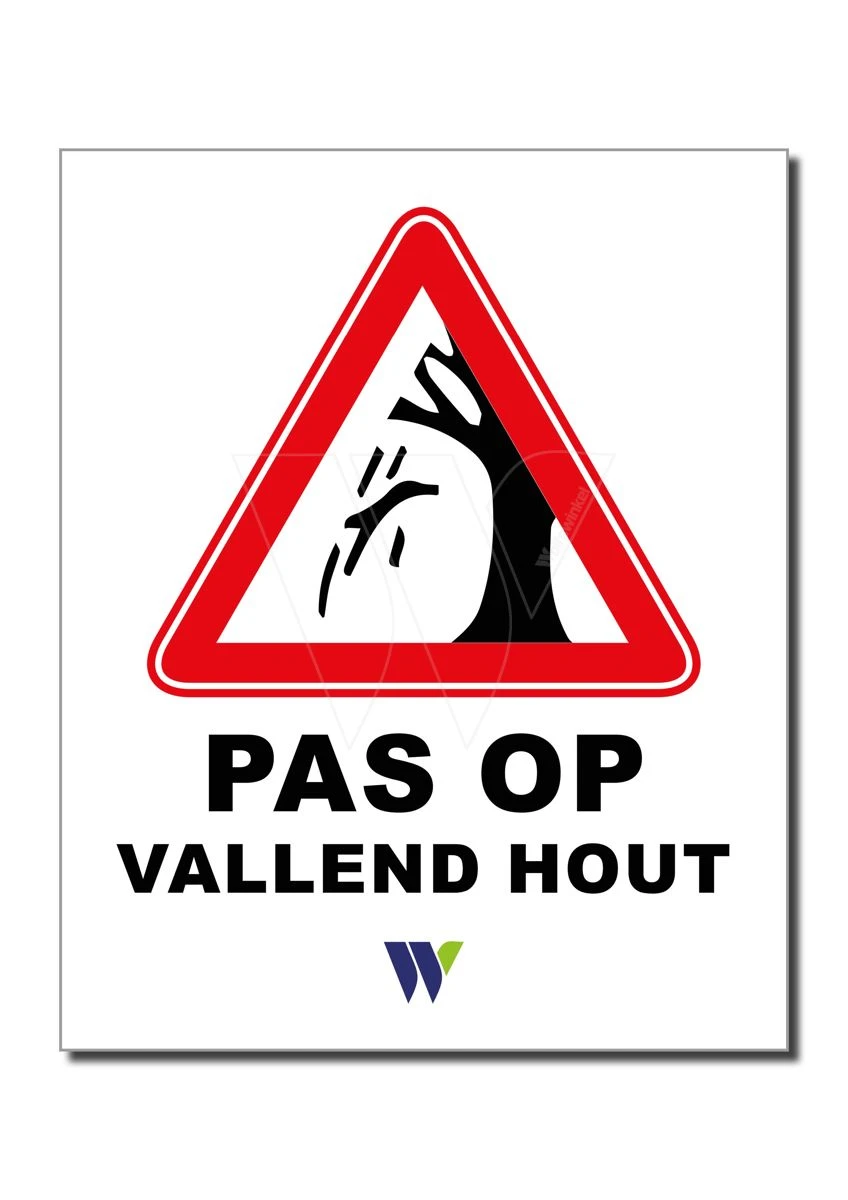 Het bord PAS OP VALLEND HOUT is gemaakt van een stevig 5 mm dik kunststof kanaalplaat, watervast en meerdere malen te gebruiken.