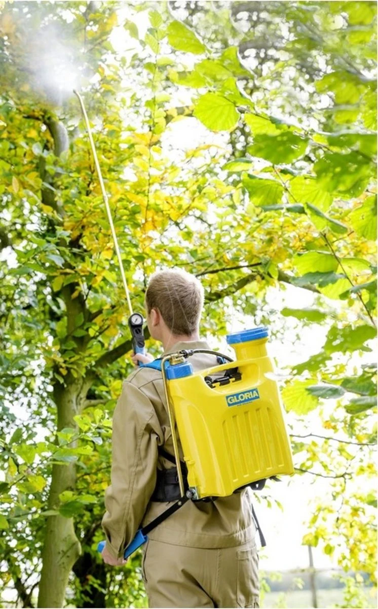 De GLORIA Pro 1800 is met een vulinhoud van 18 liter en zijn aanzienlijke reikwijdte een eersteklas keuze voor het gebruik in landbouw en bosbouw, de wijnbouw of de verzorging van planten in kassen. Het apparaat is uitgerust met een messing spuitstok inclusief een 0,5 m lang messing verlengstuk, pakkingen uit bestendig viton, een snelsluitende klep met geïntegreerde manometer alsook een ergonomische comfortgreep met softkussen. Het robuuste kunststof model beschikt bovendien over een rugbeschermende, zich het lichaam aanpassend reservoir alsook een ademingsactief professioneel draagsysteem met anatomisch gevormde schouder- en heupgordels die rug- en schouderklachten effectief voorkomen.