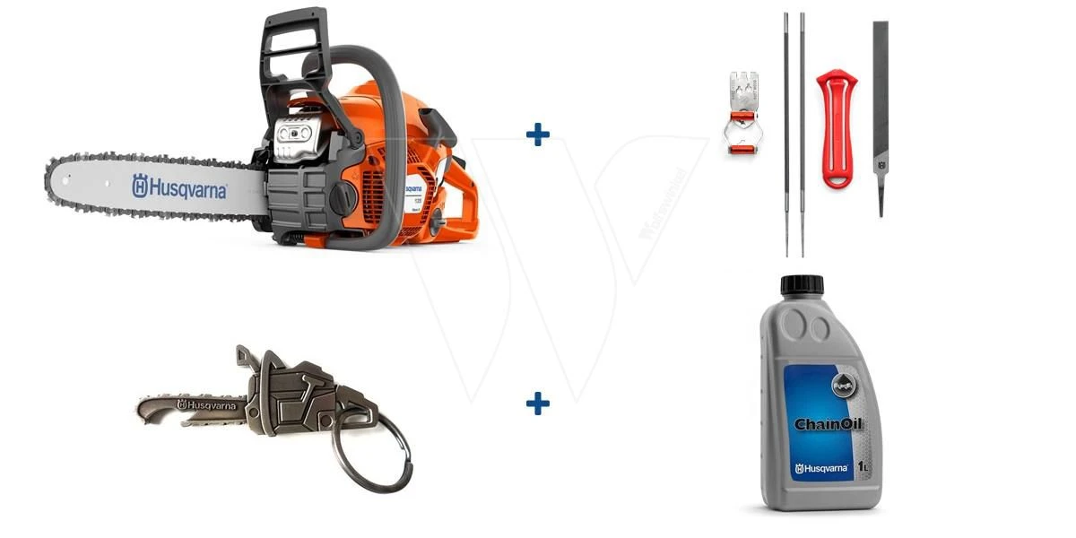 Aanbieding set Husqvarna 135 Mark II Kettingzaag + Vijlset + Olie + Flesopener