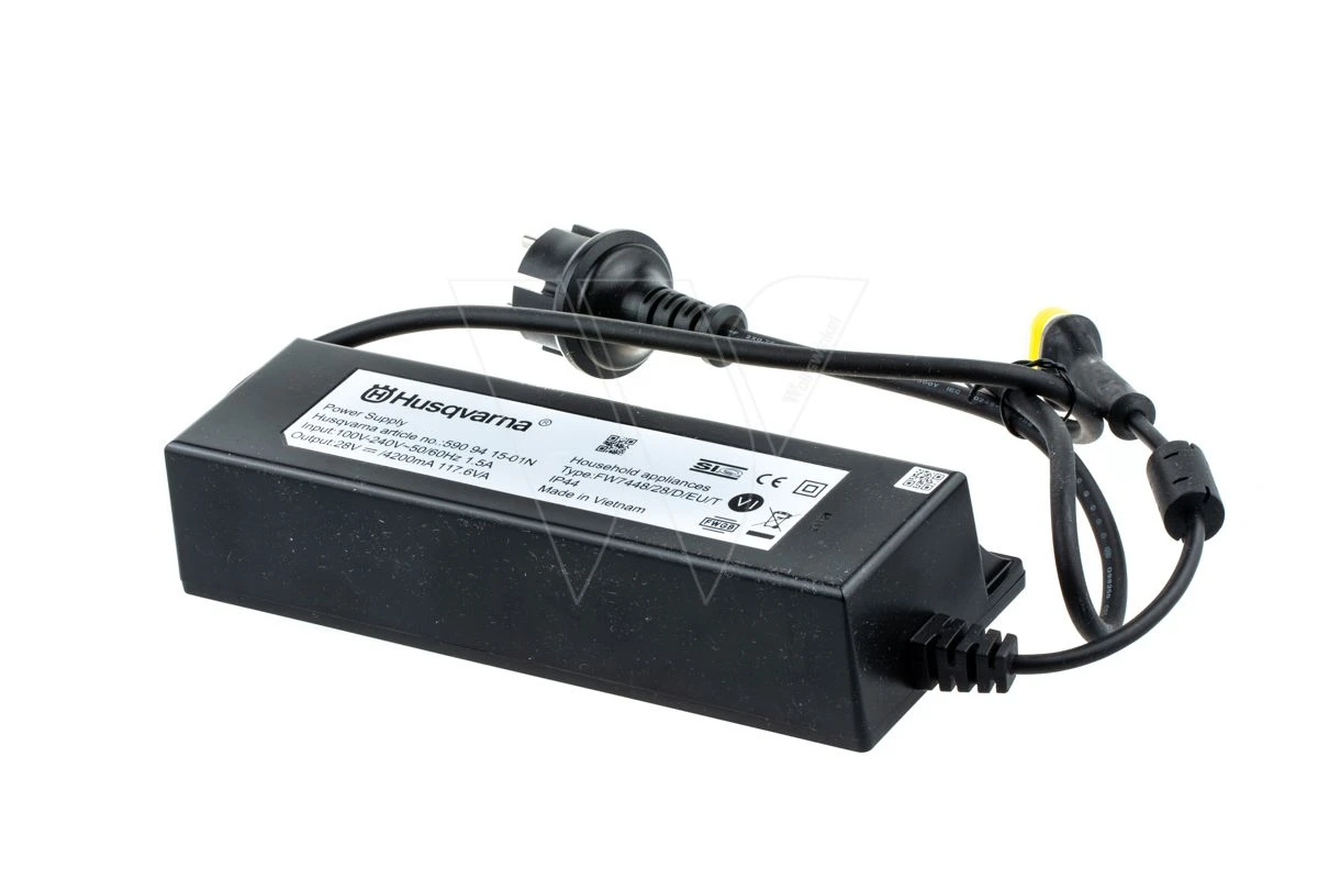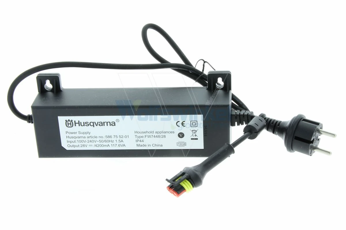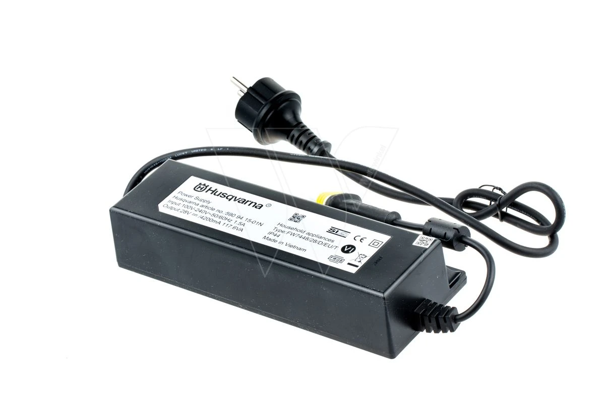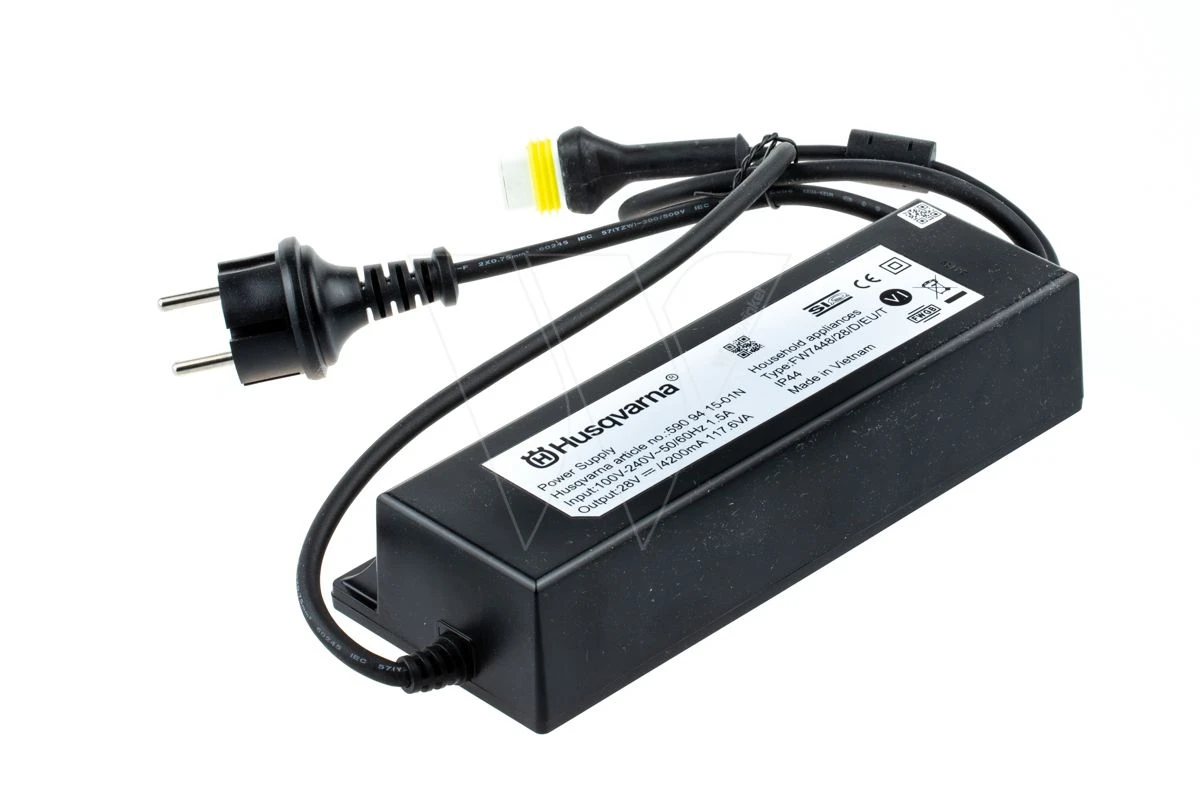 Orginele Husqvarna Trafo van af stofcontact (EU) tot laagspannings kabel naar laadstation.