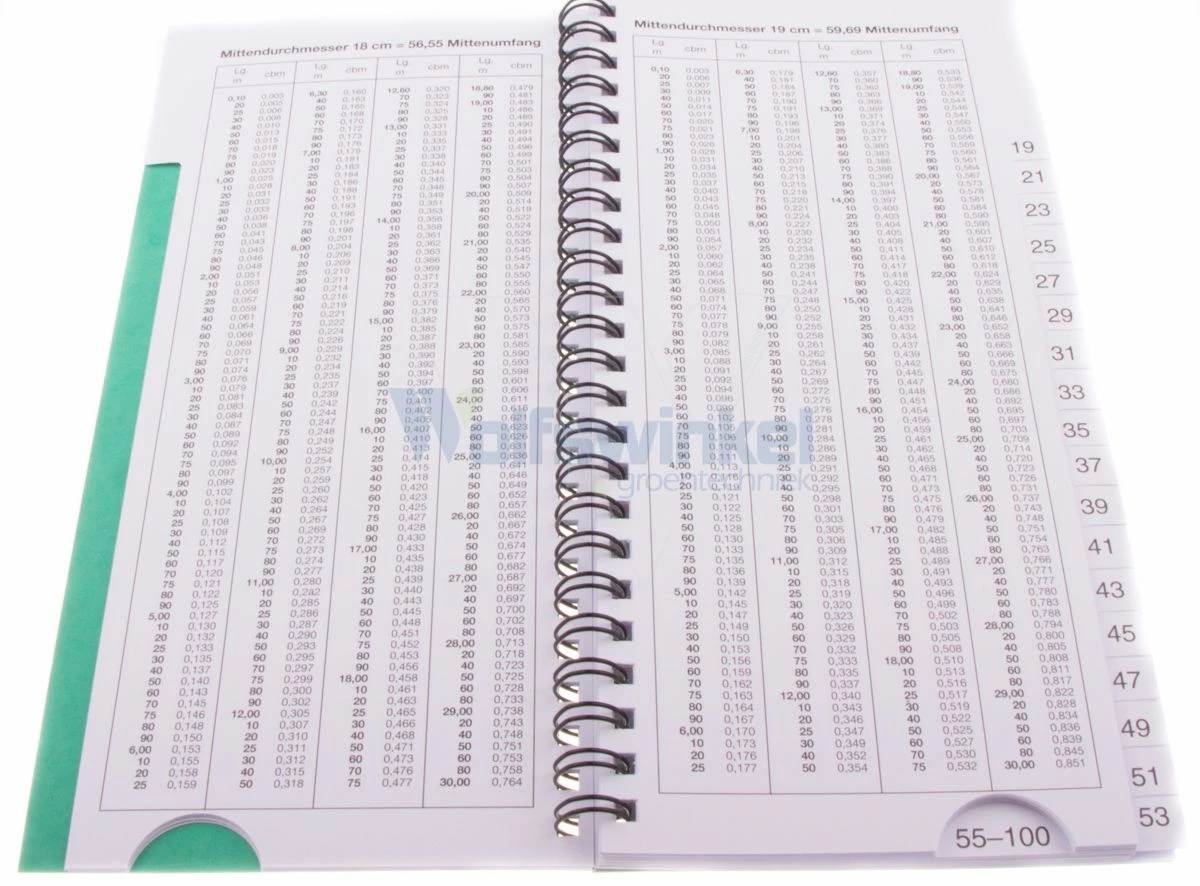 Voor het snel en secuur uitrekenen van het aantal kubieke meters hout van stammen en rondhout. Schematisch opgesteld.