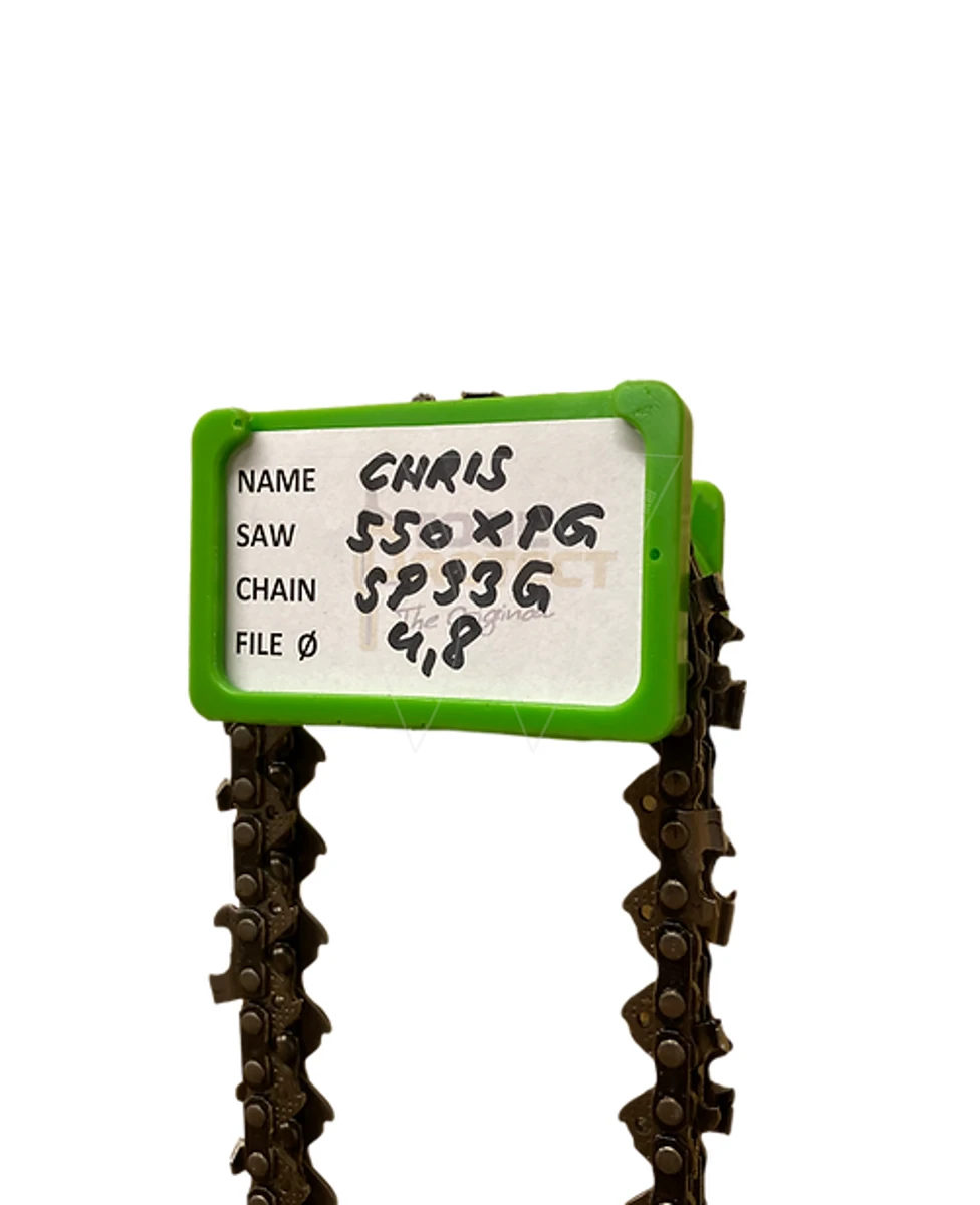 Een meegeleverd etiketplaatje maakt het mogelijk de kettingen te markeren voor een optimale toewijzing aan machines, personen en aan het juiste slijpapparaat.