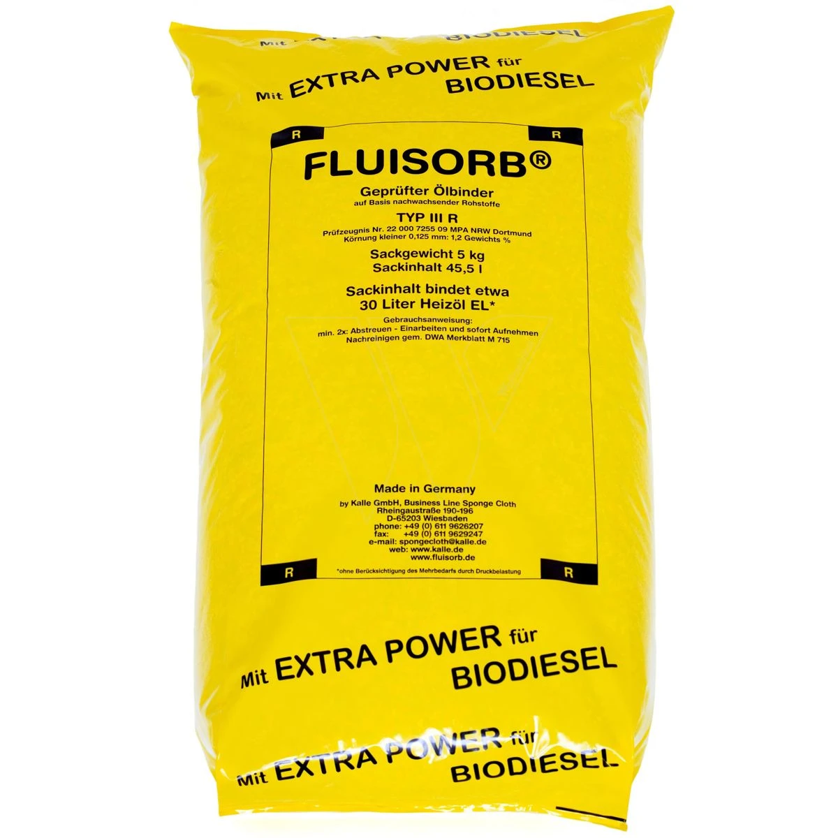 – Zeer groot absorptievermogen: 1 kg Fluisorb bindt 5,64 liter stookolie, 1 zakje bindt ongeveer 30 liter stookolie