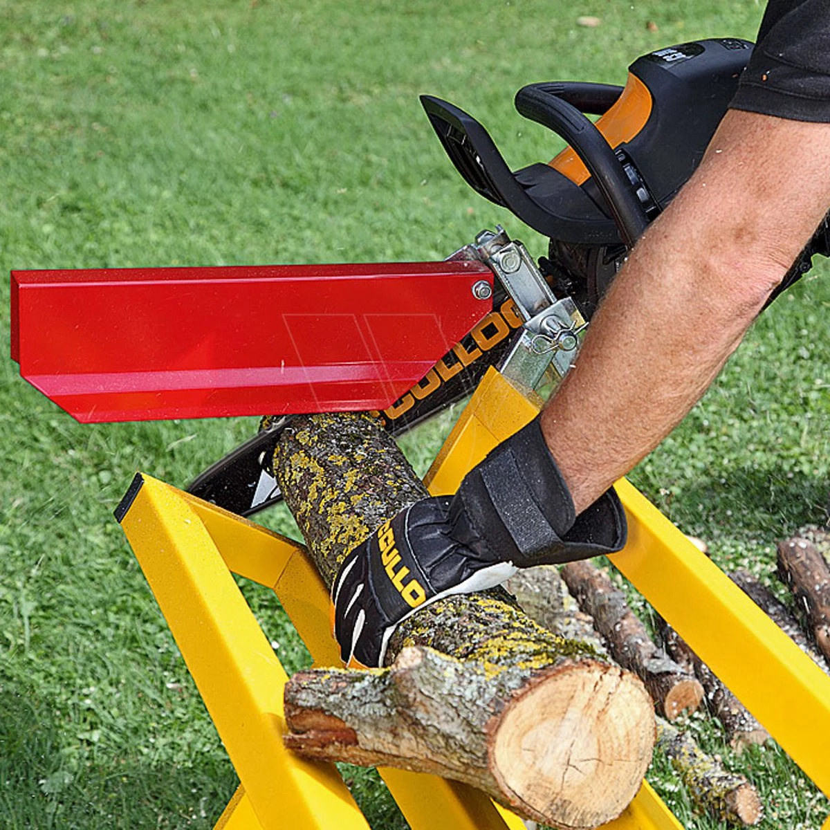 Hoogwaardige zaagbok voor extra veilig werken door dat de kettingzaag gemakkelijk gefixeerd aan de bok gemaakt kan worden. Tevens heeft deze ook een schanierbaare beschermkap over de ketting zodat u volledig veilig kan werken.